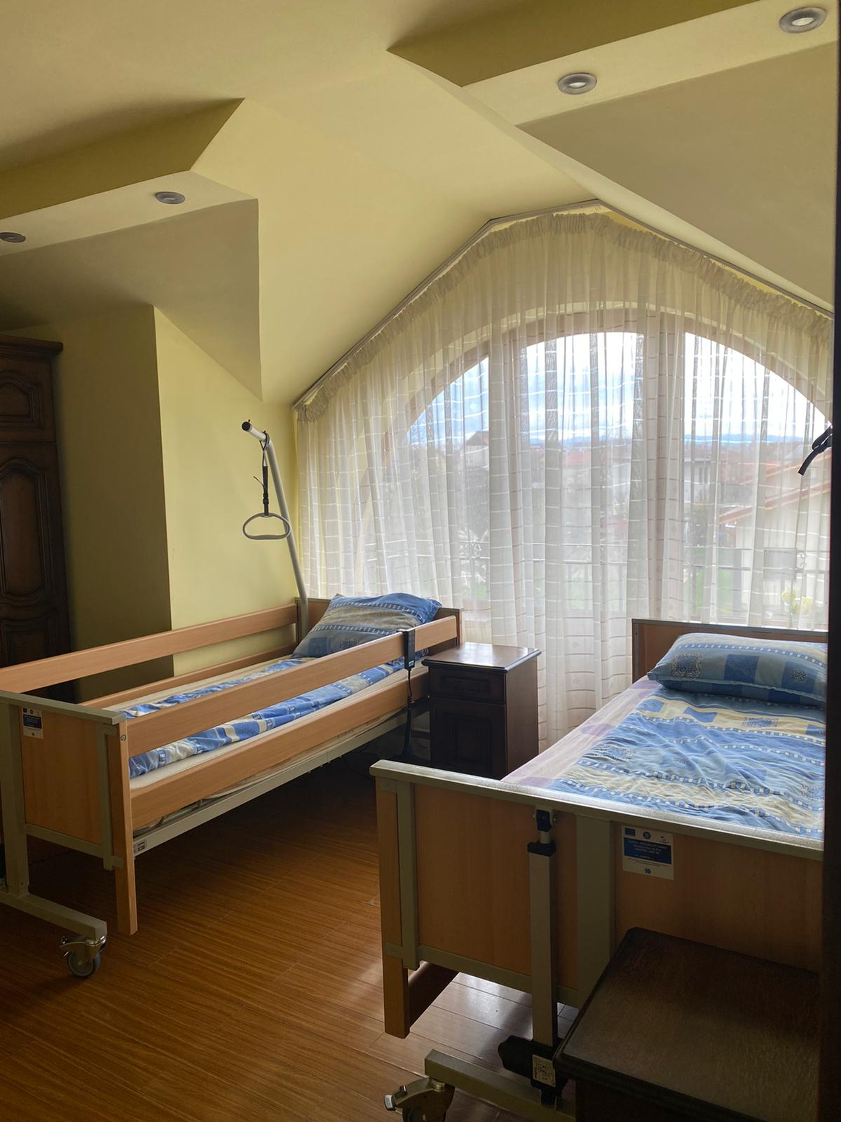 Cazare in camere de doua sau trei paturi, paturi medicale, asistenta pentru transport intern cu scaun electric, locatie in zona linistita